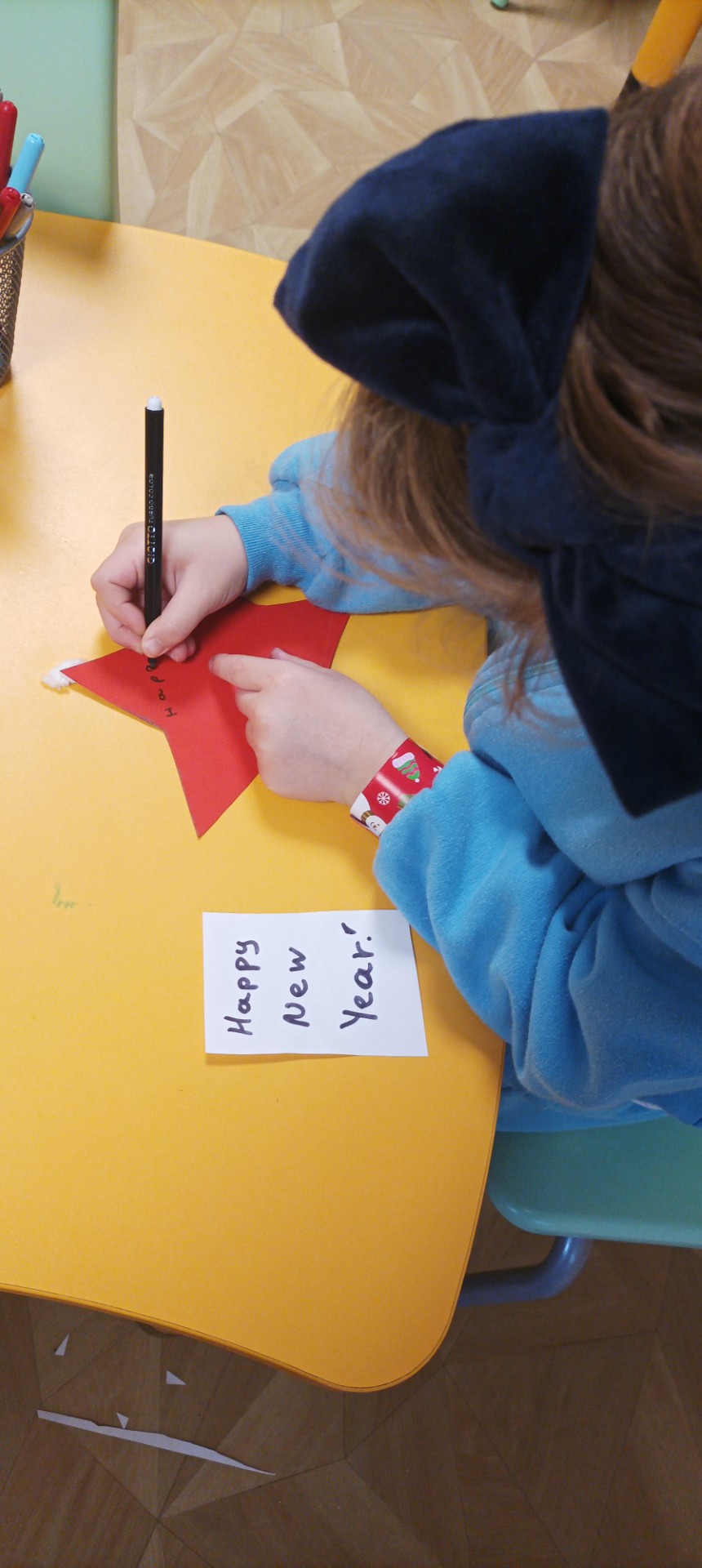 Τα παιδιά κατασκεύασαν αστεράκια ευχών, έγραψαν απλές αγγλικές φράσεις και τα έστειλαν στη Σύρο με τον Kenny, τη μασκότ του μαθήματος, μεταφέροντας χαρά, αγάπη και πολλές ευχές.