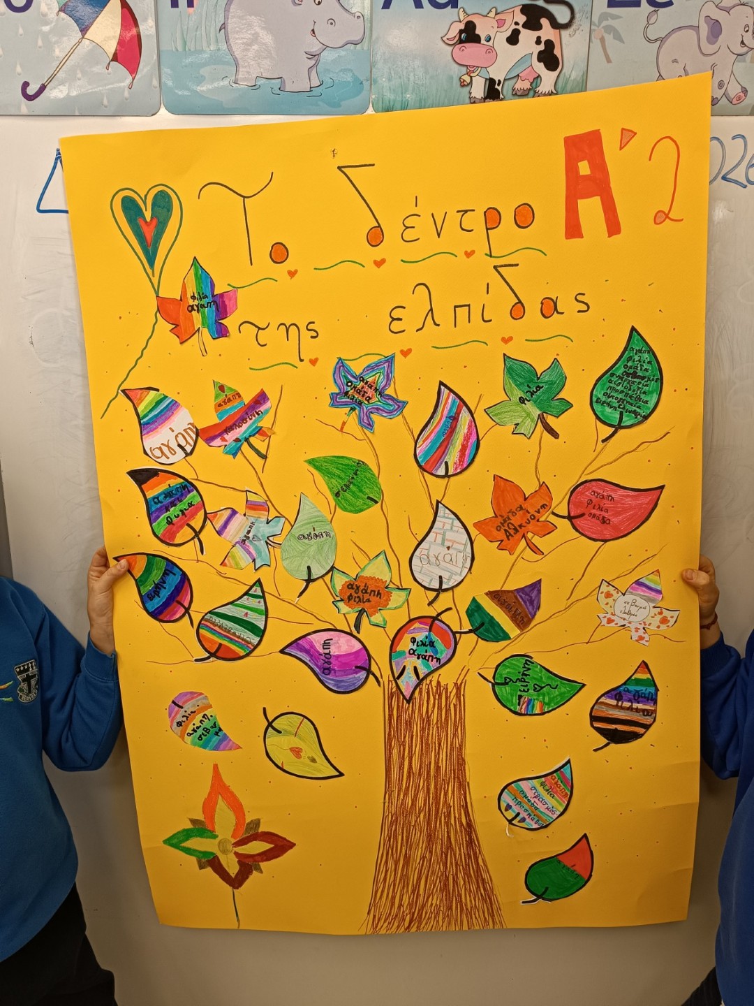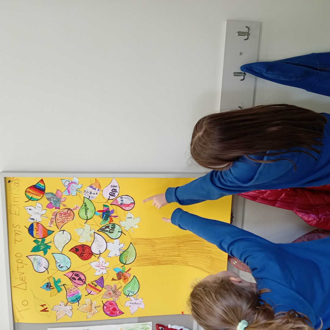 Στη συνέχεια, οι μαθητές και οι μαθήτριες υλοποίησαν μια βιωματική δράση, τη δημιουργία του «Δέντρου της Ελπίδας». Κάθε παιδί έγραψε σε ένα χαρτί μια δική του λέξη, που για εκείνο εκφράζει την έννοια της ελπίδας ή την αποτύπωσε με μια ζωγραφιά και την πρόσθεσε στο δέντρο της τάξης.