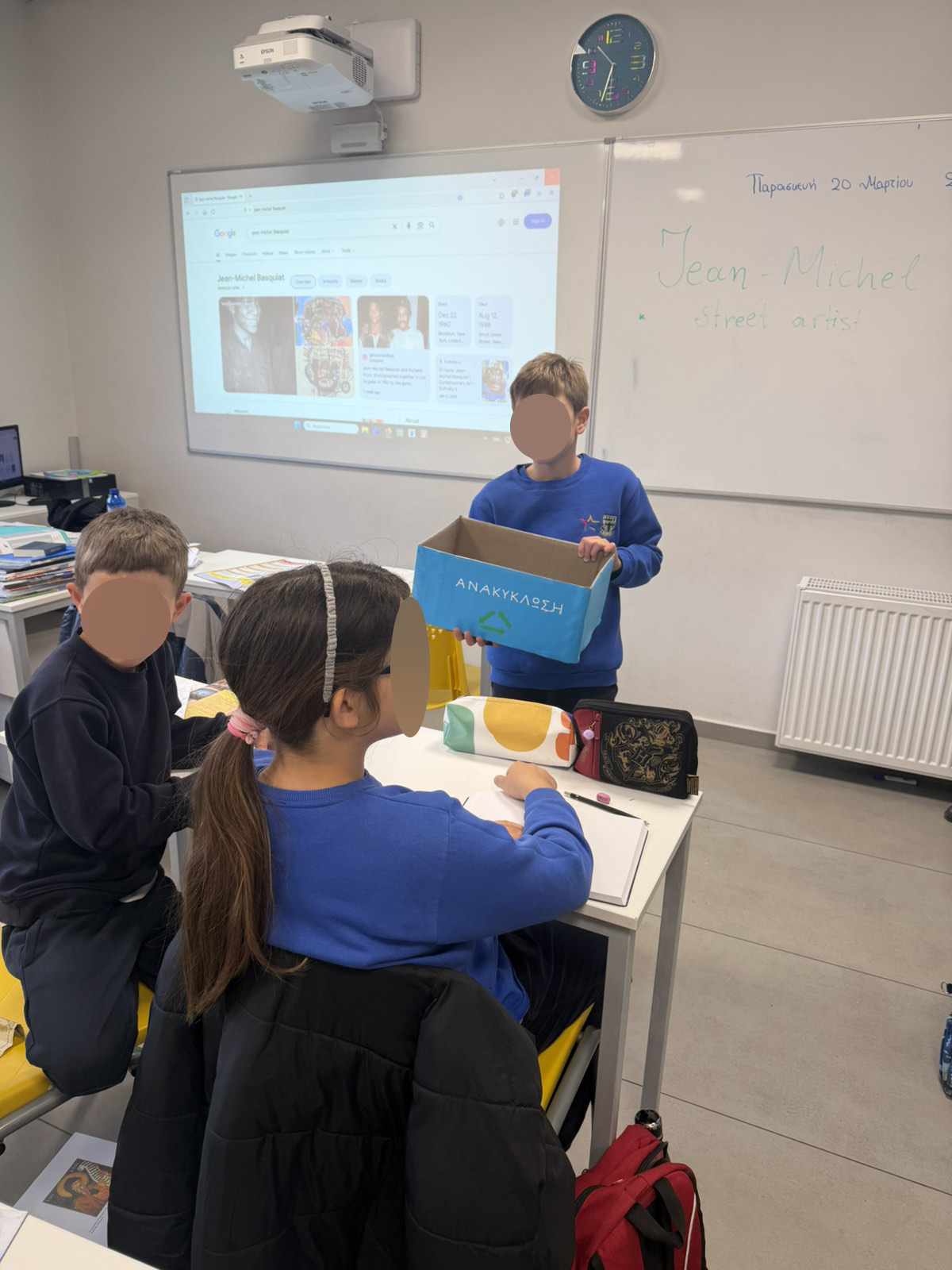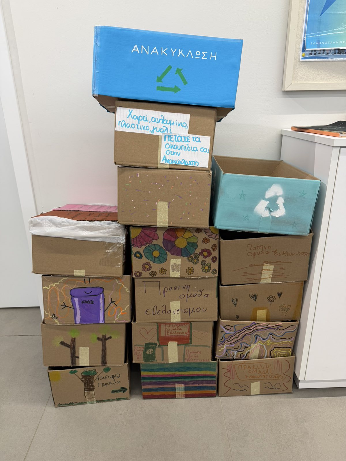 Οι εθελοντές της πράσινης ομάδας, με φαντασία και υπευθυνότητα, δημιούργησαν ξεχωριστούς κάδους ανακύκλωσης από χαρτόκουτα, τους οποίους διακόσμησαν με όμορφα σχέδια και μηνύματα. Στη συνέχεια, τους μοίρασαν σε κάθε τάξη, δίνοντας σε όλη τη σχολική κοινότητα τη δυνατότητα να συμμετέχει ενεργά στην ανακύκλωση.