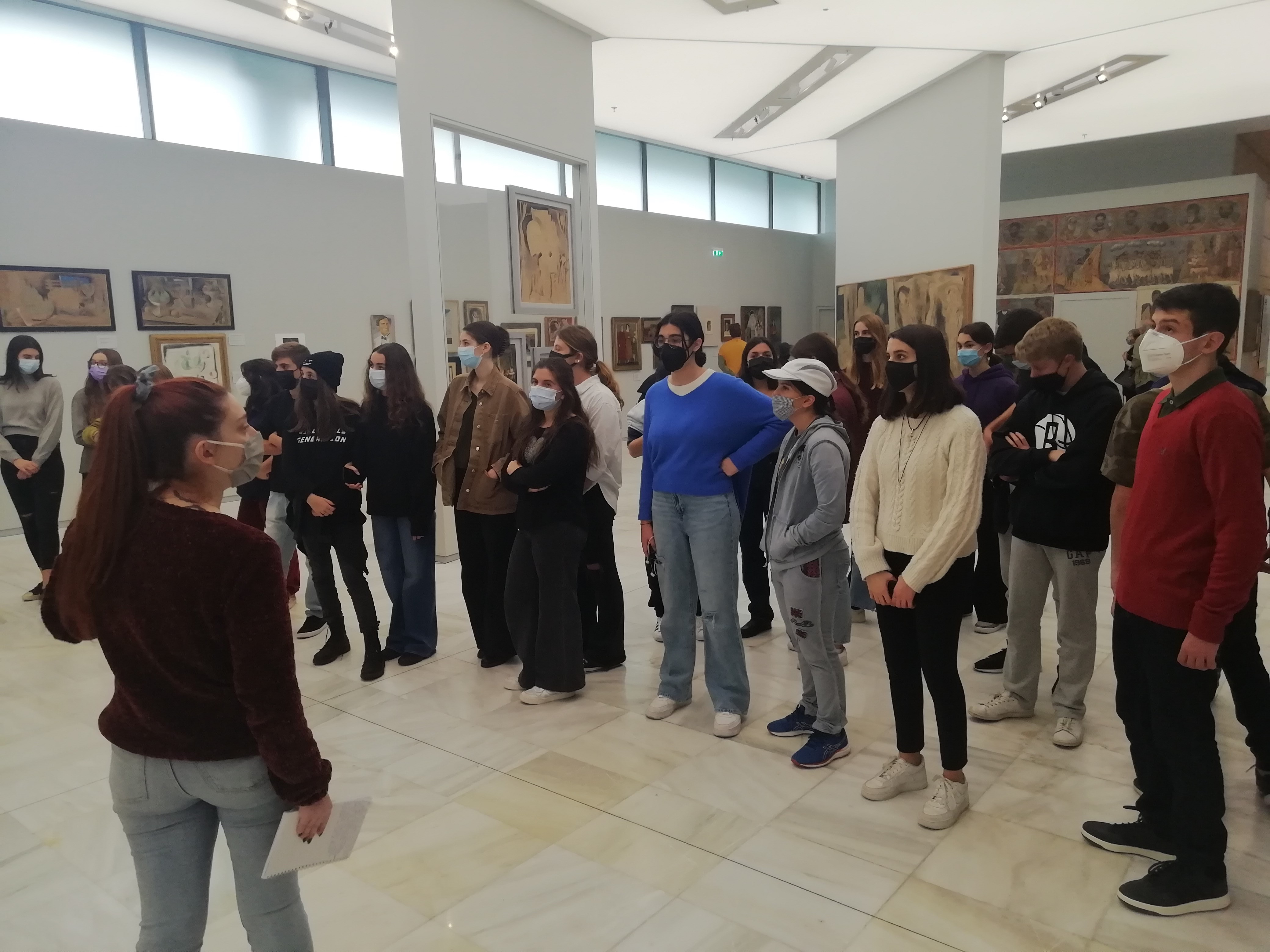 Κατά τη διάρκεια του Νοεμβρίου οι μαθητές Γυμνασίου και του Λυκείου της Ελληνογαλλικής Σχολής Ουρσουλινών επισκέφθηκαν την προσφάτως ανακαινισμένη Εθνική Πινακοθήκη. Εκεί, ξεναγήθηκαν στο μοντέρνο χώρο της και απόλαυσαν μερικά από τα σημαντικότερα έργα των διασημότερων Ελλήνων καλλιτεχνών. Με αφορμή την επέτειο των 200 χρόνων από την Ελληνική Επανάσταση του 1821, η ξενάγηση ξεκίνησε από τον πρώτο όροφο, όπου φιλοξενούνται έργα που απεικονίζουν εικόνες της εποχής εκείνης, όπως αποτυπώθηκαν από τους σημαντικότερους καλλιτέχνες, όπως ο πίνακας του Θεόδωρου Βρυζάκη με τίτλο “Η Ελλάς ευγνωμονούσα”. Έπειτα, περιηγήθηκαν ανάμεσα στα έργα του Νικηφόρου Λύτρα και του Νικόλαου Γύζη, όπου απεικονίζονται καθημερινές σκηνές της εν λόγω περιόδου σύμφωνα με το εγχώριο ρεύμα της ηθογραφίας. Στη συνέχεια, εξερεύνησαν τα έργα του Νίκου Χατζηκυριάκου-Γκίκα, τα οποία έχουν εμφανείς επιρροές από το κίνημα του κυβισμού, καθώς και το ύφος του Κωνσταντίνου Παρθένη στον πίνακα “Αποθέωση του Αθανασίου Διάκου”. Οι μαθητές είχαν ακόμη την ευκαιρία να δουν από κοντά και τα έργα του Νίκου Εγγονόπουλου, ο οποίος υπηρέτησε τον υπερρεαλισμό, και να παρατηρήσουν την ιδιαίτερη τεχνοτροπία του. Κατόπιν, μεταφέρθηκαν στη σύγχρονη εποχή, όπου ανακάλυψαν το εύρος που έχει η τέχνη στον 20ο και 21ο αιώνα. Οι μαθητές μπήκαν στα μονοπάτια του Γιάννη Γαΐτη και έμαθαν για το “πάντρεμα” της μηχανικής με την τέχνη μέσα από τα έργα του Τάκη. Τέλος, ενθουσιάστηκαν με τον πίνακα “Κολυμβητές”, ο οποίος δημιουργήθηκε από την Μαρία Φιλοπούλου, απόφοιτο της Ελληνογαλλικής Σχολής Ουρσουλινών, στην οποία υπήρξε και καθηγήτρια καλλιτεχνικών.